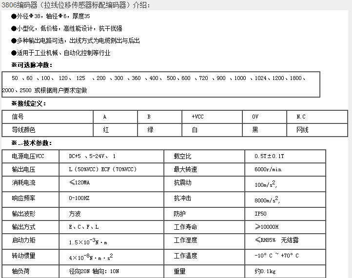 3806電梯位移編碼器把角位移或直線位移轉(zhuǎn)換成電信號,前者稱為碼盤,后者稱為碼尺。按照讀出方式編碼器可以分為接觸式和非接觸式兩種;按照工作原理編碼器可分為增量式和絕對式兩類。增量式編碼器是將位移轉(zhuǎn)換成周期性的電信號,再把這個電信號轉(zhuǎn)變成計數(shù)脈沖,用脈沖的個數(shù)表示位移的大小。絕對式編碼器的每一個位置對應(yīng)一個確定的數(shù)字碼,因此它的示值只與測量的起始和終止位置有關(guān),而與測量的中間過程無關(guān)。